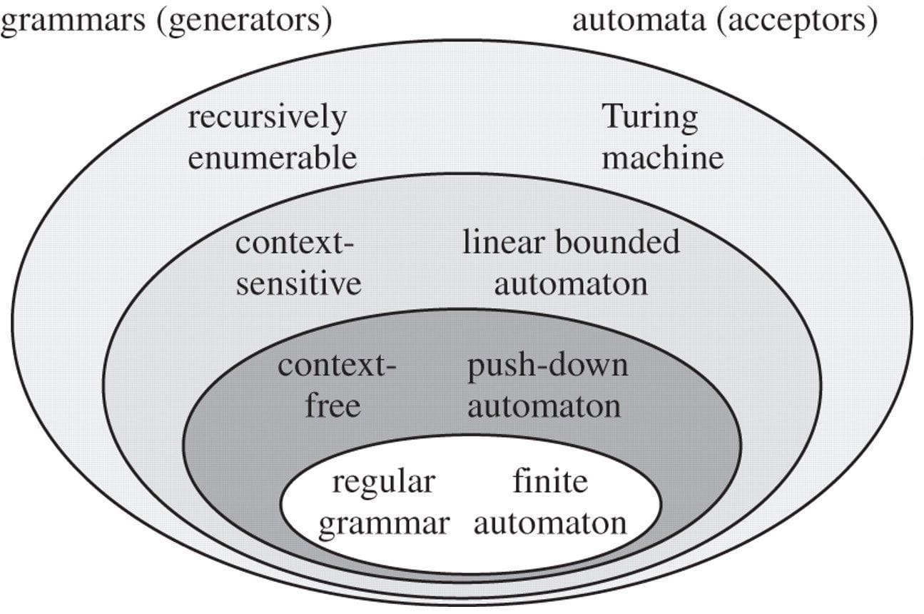 This hierarchy demonstrates how automata - meaning 'theoretical computers' - of differing levels of technical power were limited and enabled to differing levels of grammatical - that is, 'language-interpreting' - computational capacity.